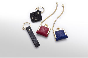 江戸木版画の伝統工芸師との共同作品。越前生漉奉書と言うとても丈夫な和紙に一枚一枚手で摺り上げた木版画。 版画と革を特殊な技法で貼り合わせエイ革と縫い上げた珠玉の一品。
