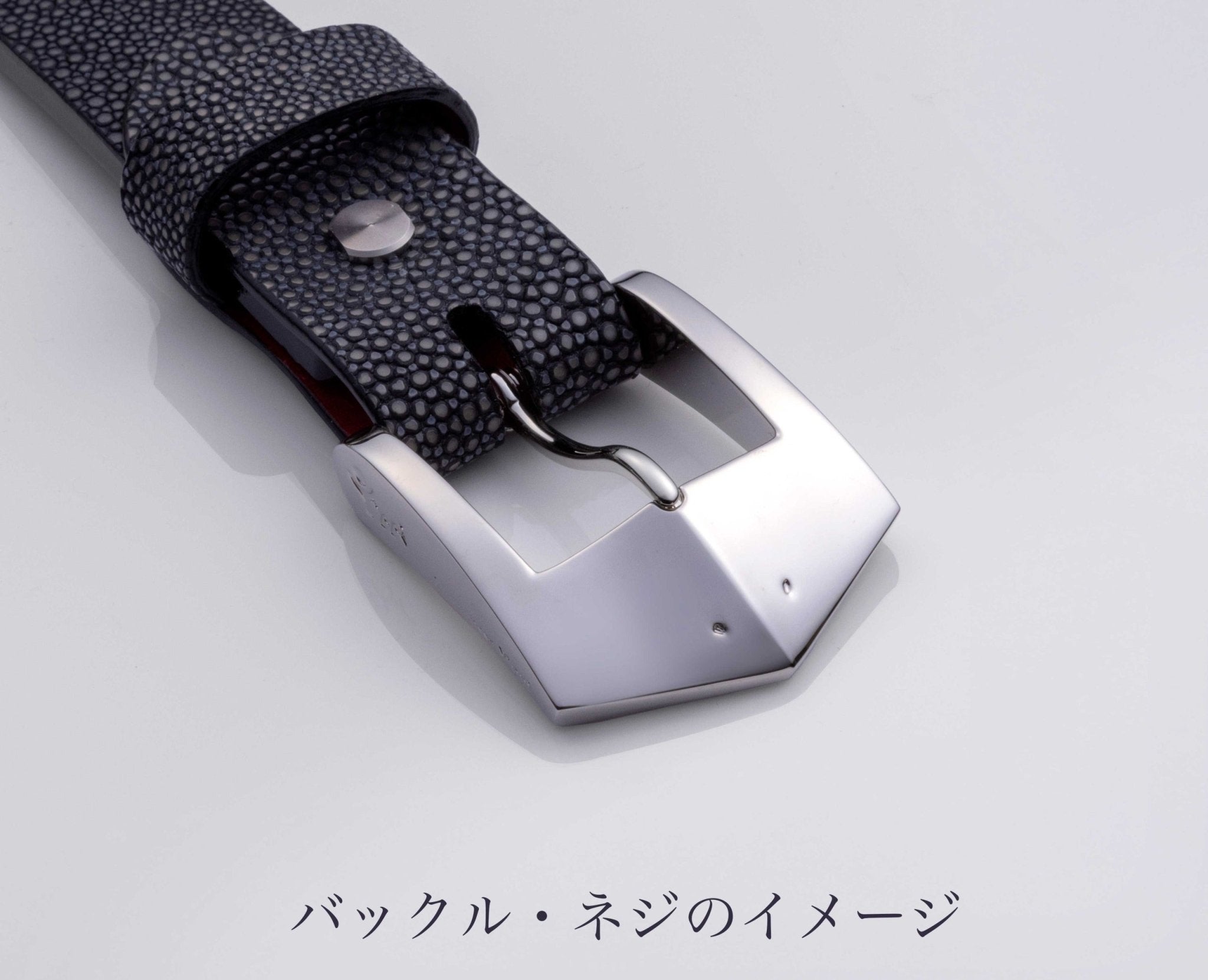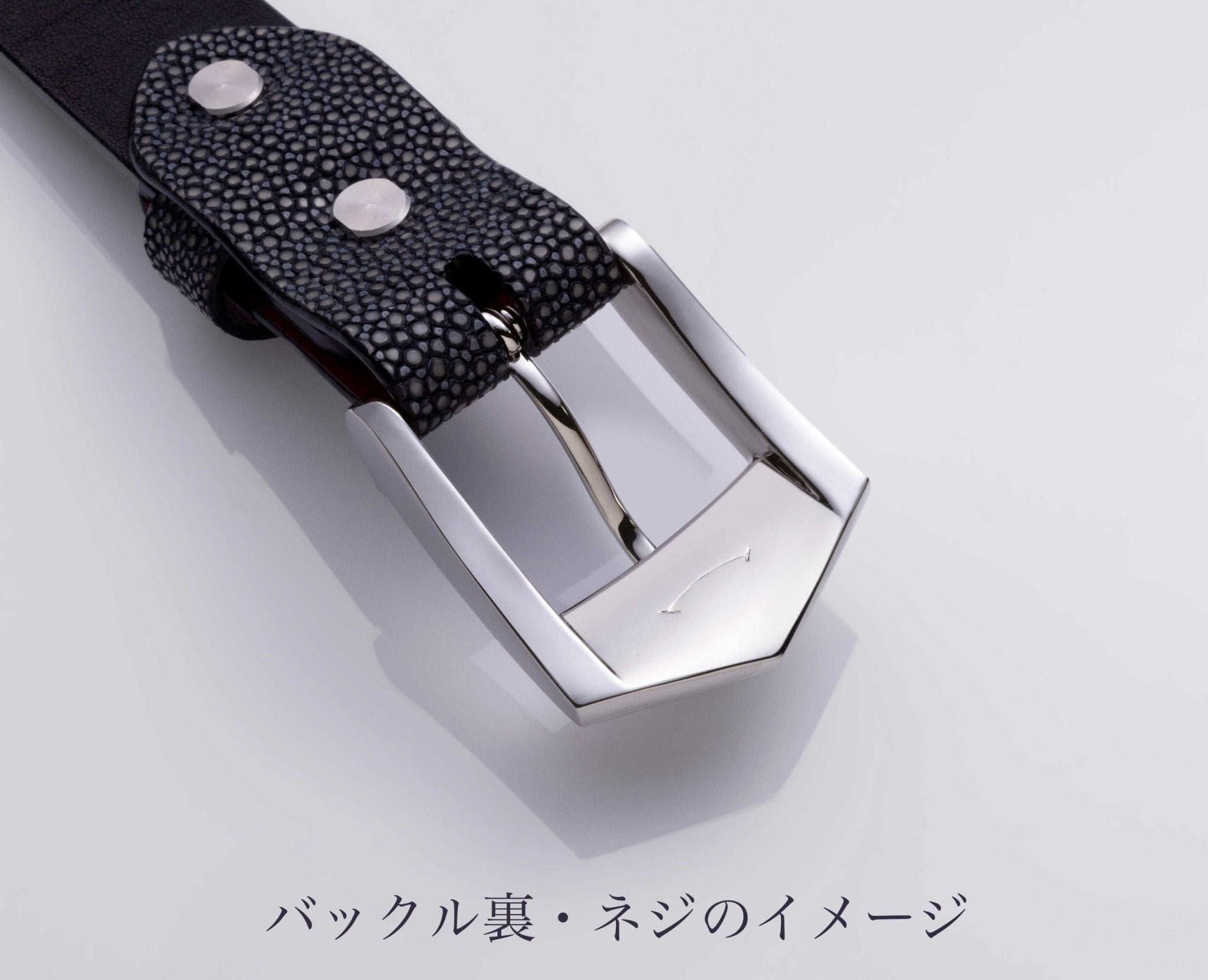 エイ革ベルトはバックルやピンがあたる穴部分が非常に痛みにくい特徴があります。分厚く丈夫に仕上げた強度のあるベルトです。エイの形になっているバックルは高級なロジウム鏡面仕上げで金属アレルギーを起こしにくく、ネジは特注ステンレス製で共に耐腐食性に優れます。