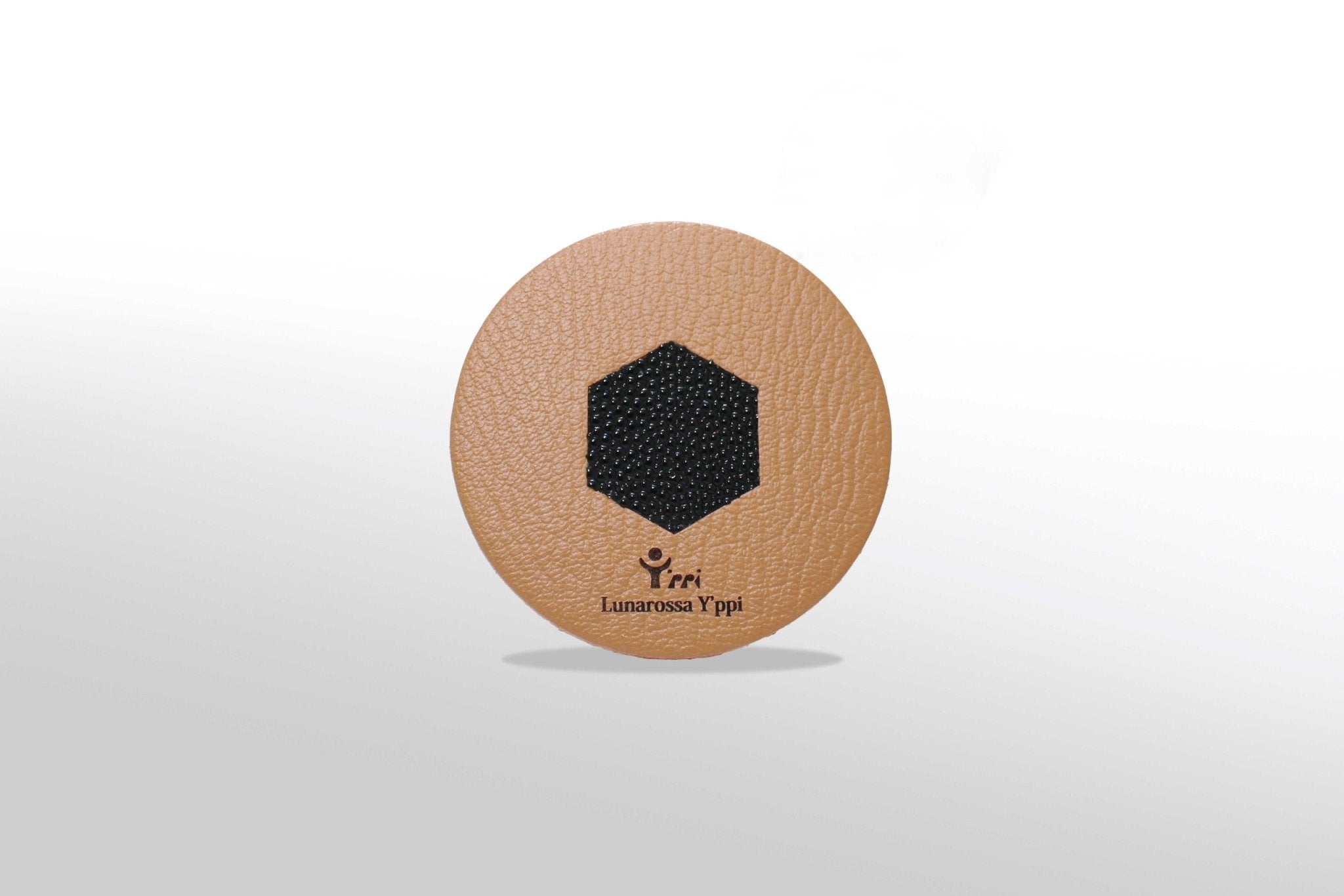 エイ革と牛本革をコルクに貼り合わせたコースター。六角形は亀の甲羅を模した「亀甲文様」と言われ、縁起の良い図形として知られています。香炉の敷物にもお使い頂けます。