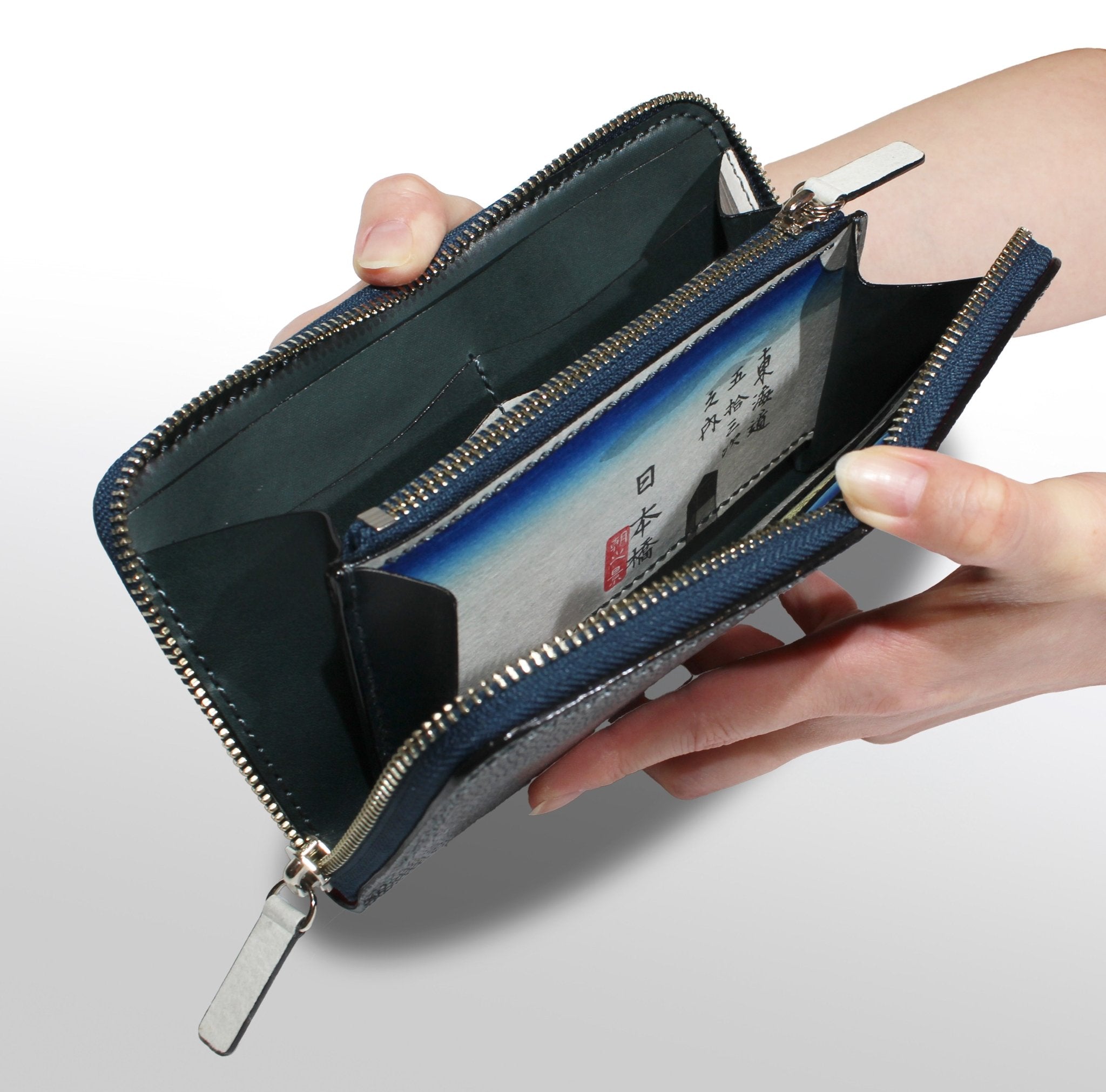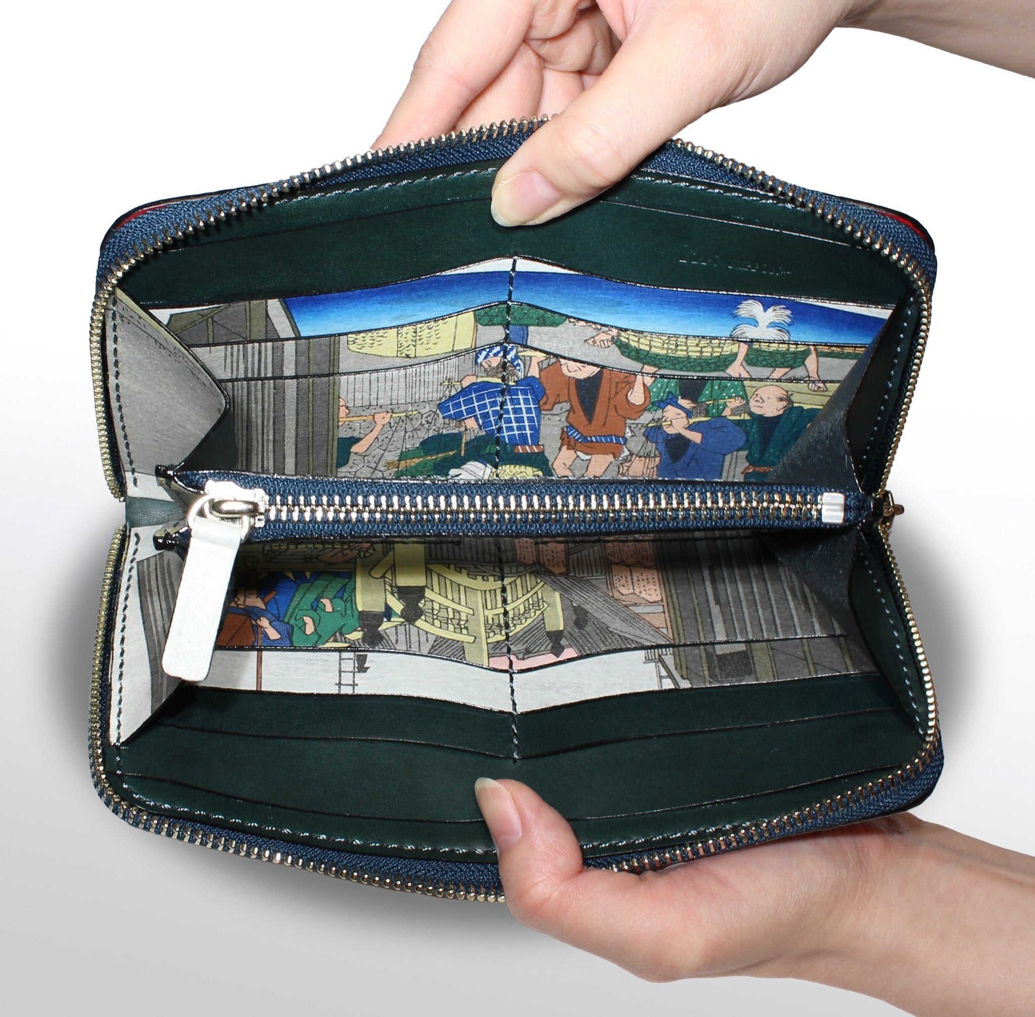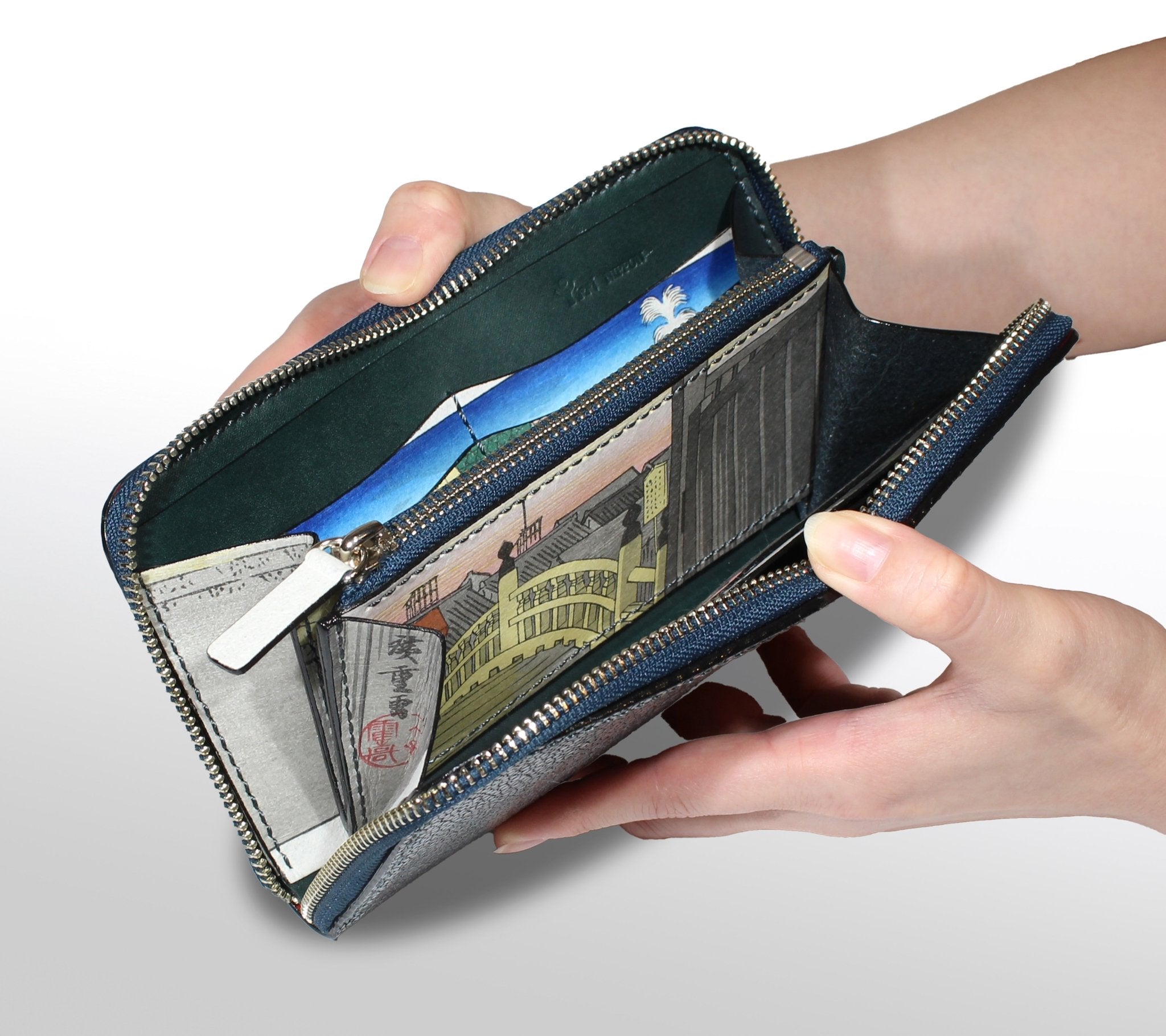 This is a collaborative work with a traditional craftsman of Edo woodblock prints. It is a one-of-a-kind item with washi paper pasted on the interior. The Edo woodblock prints are hand-printed one by one on very strong washi paper called Echizen Kizuki Hosho. The Edo woodblock prints are pasted on cowhide using a special technique and sewn with ray leather to create a one-of-a-kind item.
