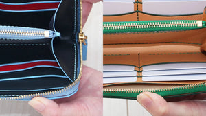 内装には一枚革を使用する為、初め部分的に歪んで見えることがあります。使い初めは、ある程度の枚数を入れて一晩程馴染ませてください。馴染ませて頂くことにより無くなります。