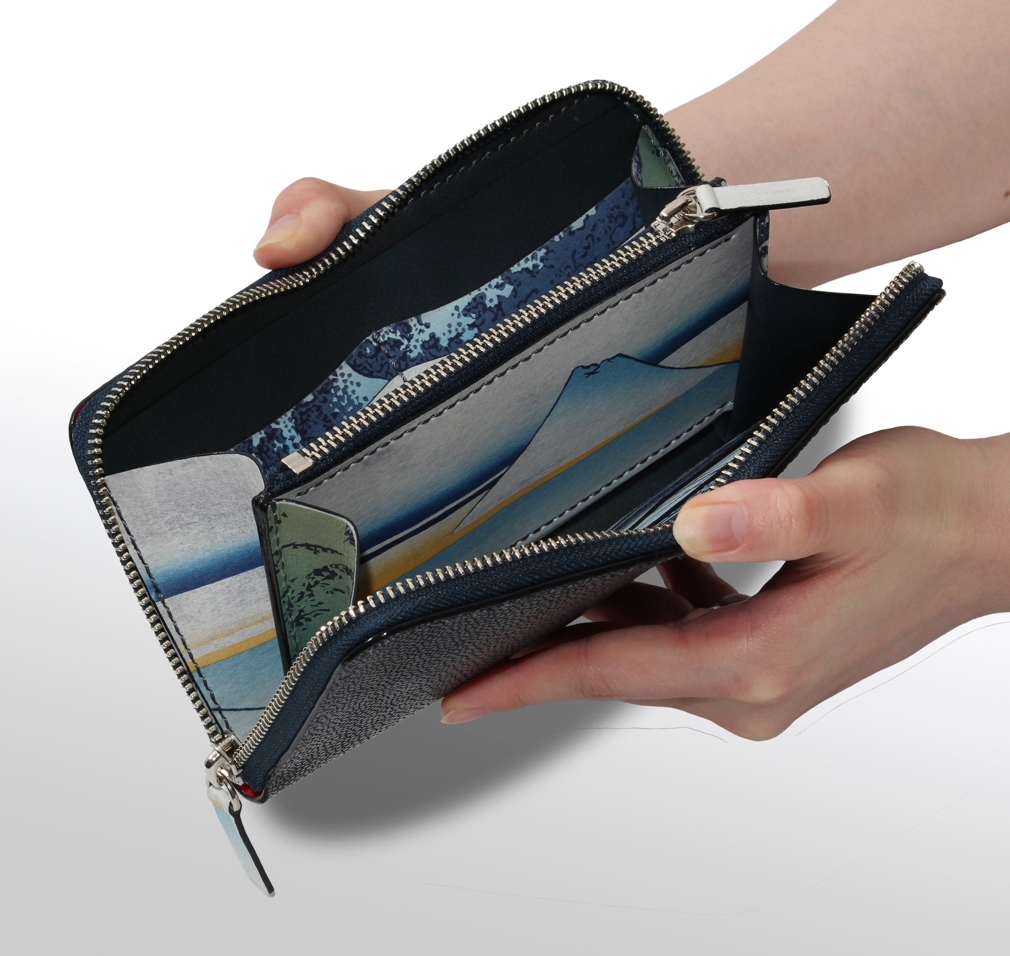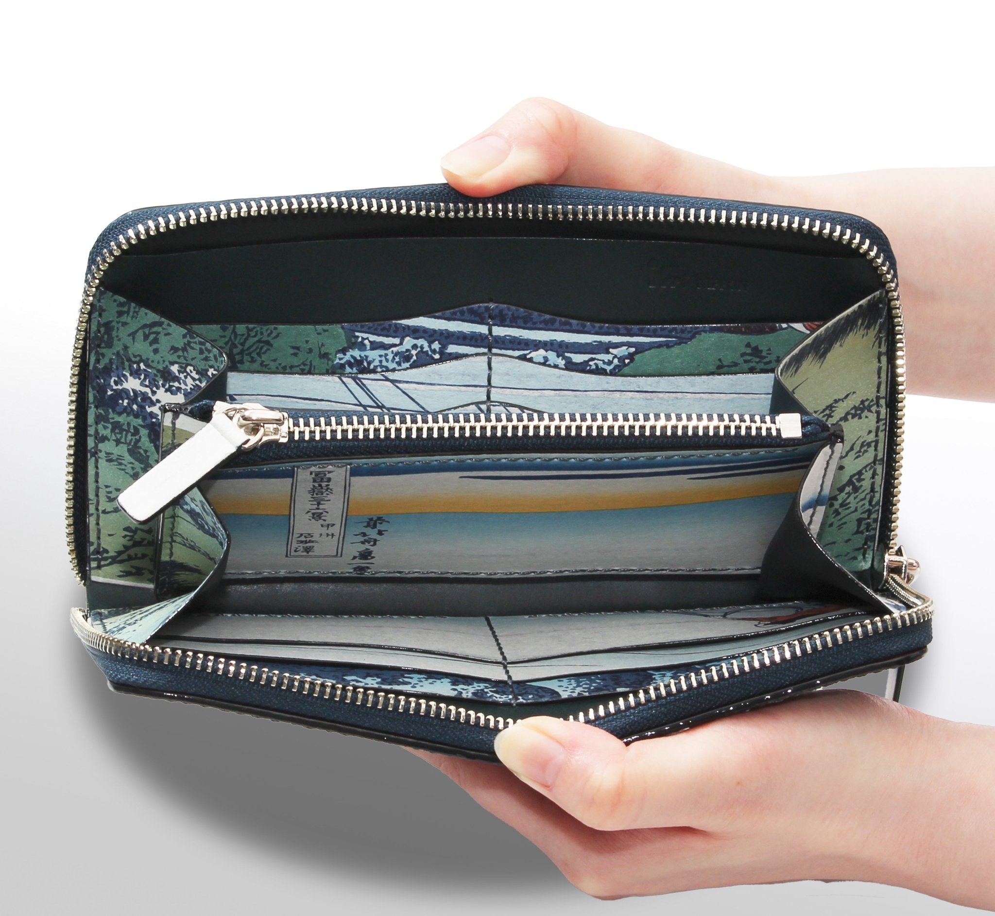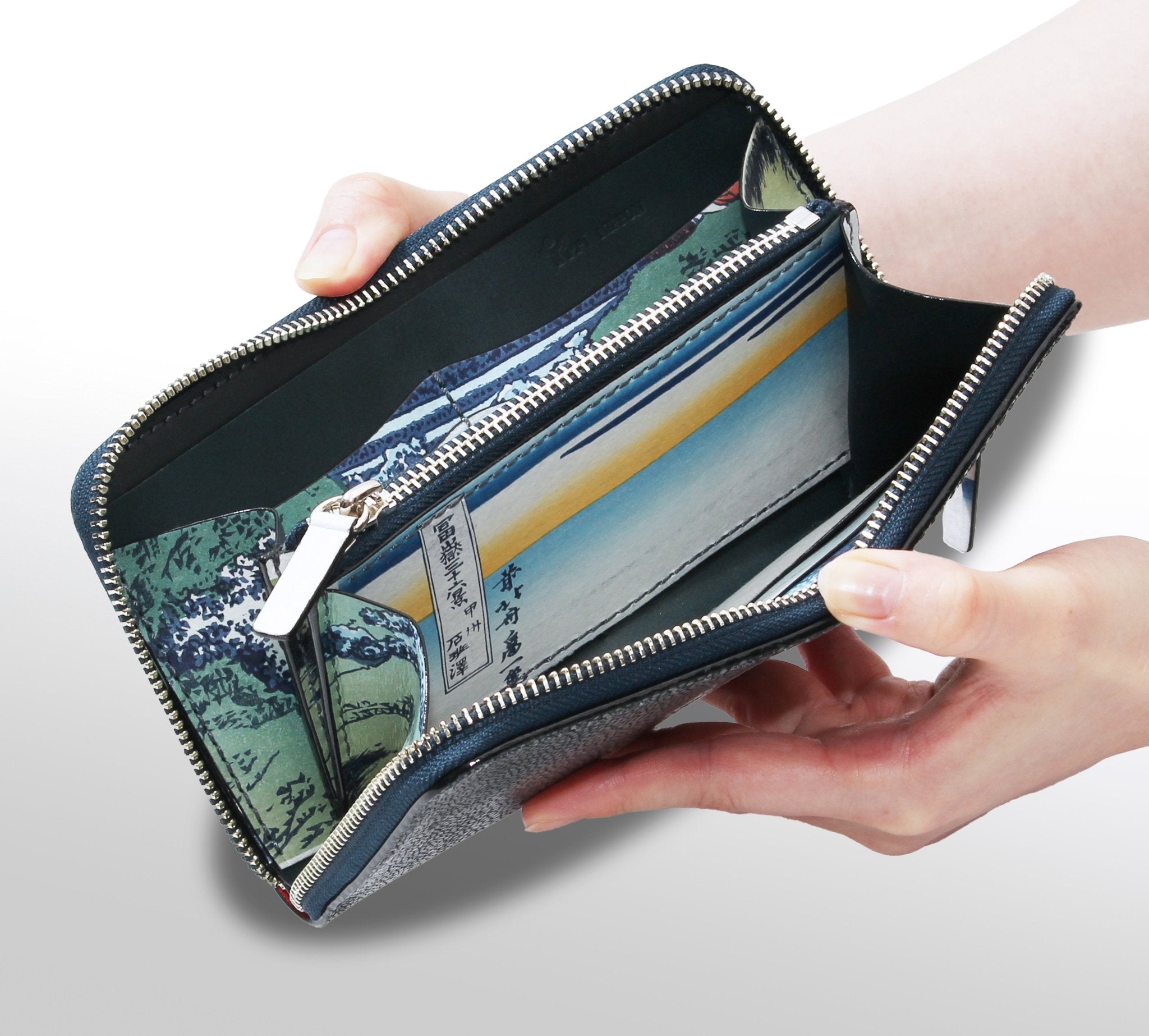 這是與傳統江戶木版畫畫家合作的作品。 一件內部貼有和紙的獨特作品。 這些江戶木版畫都是在一種名為「越前木月紙」的非常堅固的日本紙上一張一張手工印刷的。 這件獨特的作品採用特殊技術將江戶木版畫和牛皮黏貼在一起,並用鰩魚皮縫製而成。